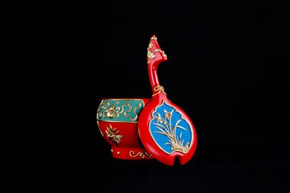 泥金彩漆16件:双龙长提桶、讨奶桶、软掼提桶、圆和盒、马桶、八角果子桶2个、茶叶罐2个、镇纸(一对)、扇面(5把);严海斌的朱金漆木雕作品《福星高照》4幅、童献松的朱金漆木雕龙舟一艘。