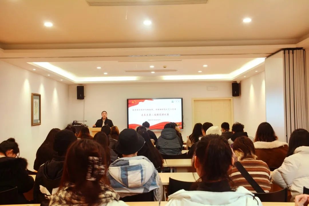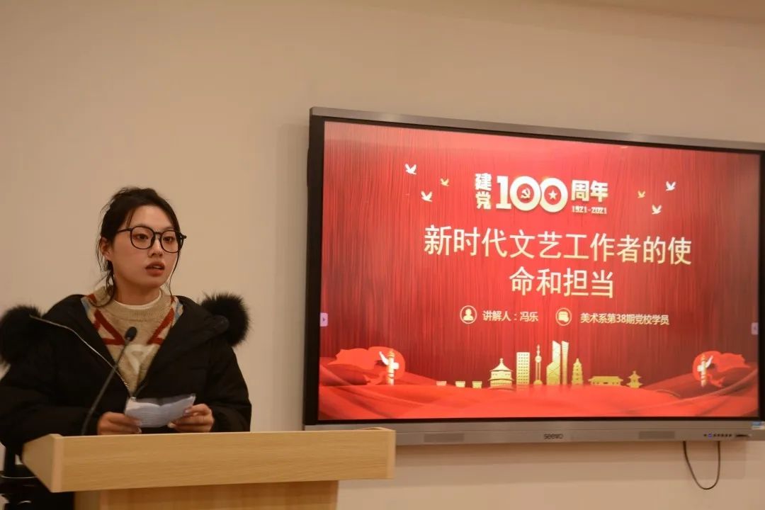 12月17日,美术系学生党支部开展“奋进新征程担当新使命  争做新时代文艺工作者”第二届主题微党课比赛。此前,来自第38期党校学员的10名同学,经过系部初赛选拔后,共有5名同学脱颖而出参加本次微党课决赛。美术系组织员章彪、学生党支部书记龚林峰、团总支副书记朱丹丹出席并担任比赛评委。全体学生党员、入党积极分子代表、青年理论学习小组成员代表等现场观摩学习。