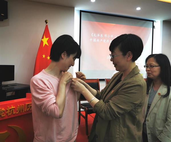 会议最后,党总支为入党5巴蕾、陈蔚和胡晨菲三位同志举行集体“政治生日”会。汪琳为三位同志重新佩戴党徽,党员教师李雪芬为她们赠送美术系专属设计的政治生日贺卡。