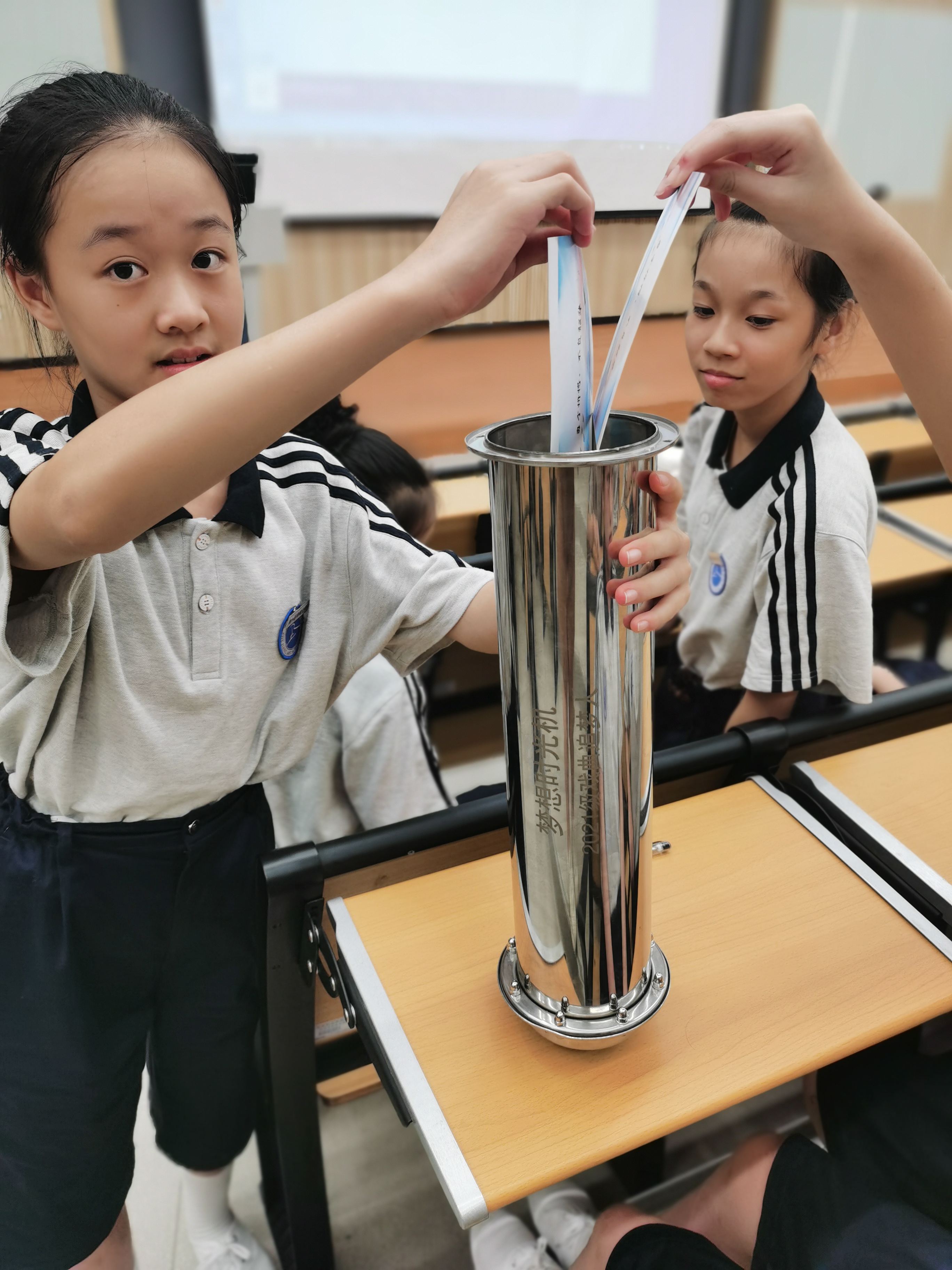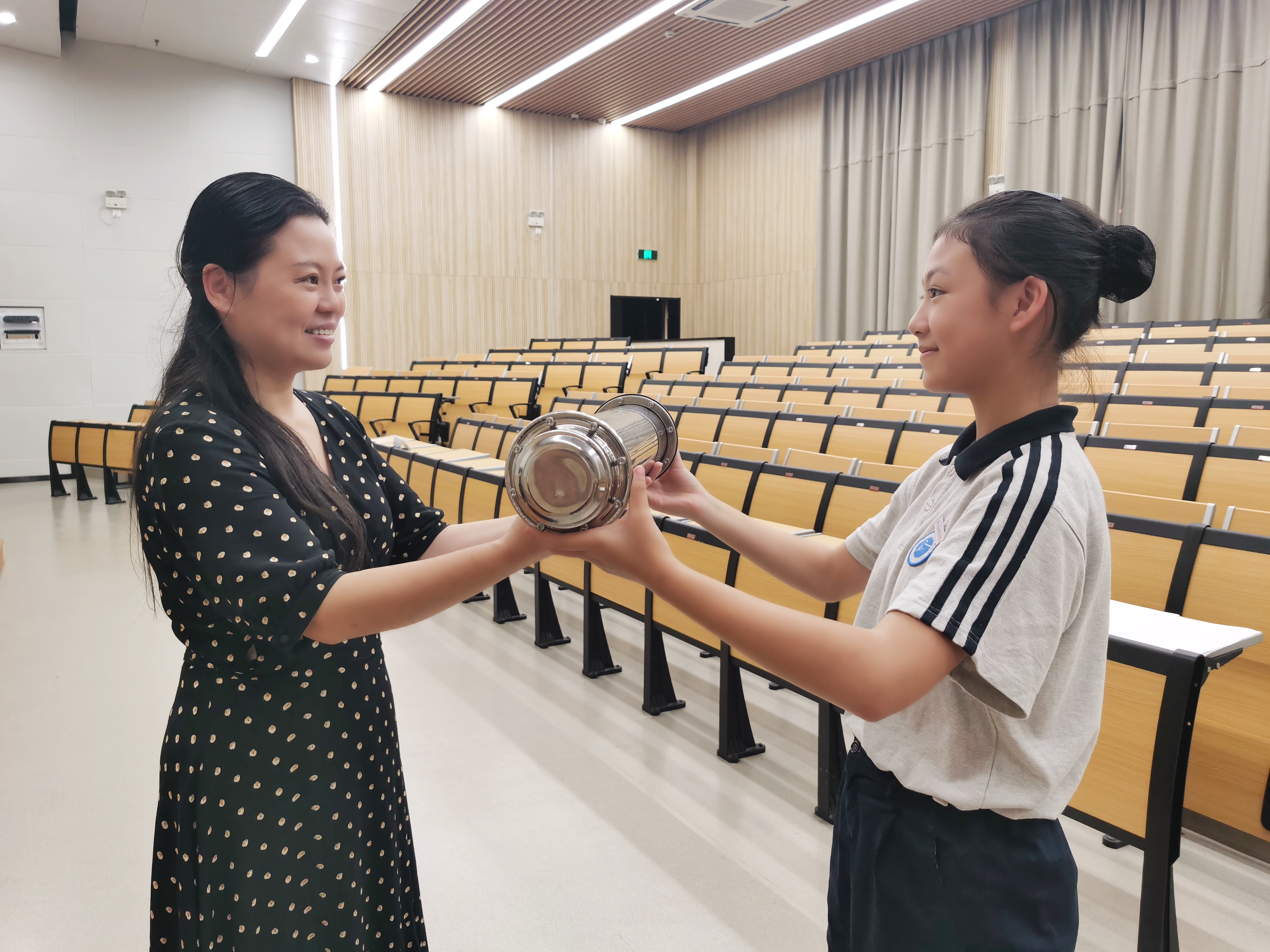 在充满希冀的校歌声中,同学们和辅导员吴晨喜把写着对未来期待、努力方向的明信片装进梦想时光机,并一起将时光机进行封存。杭越班学生杨漫妮将装满了新生梦想的时光机郑重交给杨晓浤保存,此后,这台承载着每一位新生沉甸甸的梦想的时光机,将伴随同学们一路成长,并在毕业前夕再次开启。同学们将与此刻的自己对话,跟此刻的梦想重聚,敦促同学们珍惜时光,踏踏实实朝着梦想的前方迈进,把梦想变成现实。