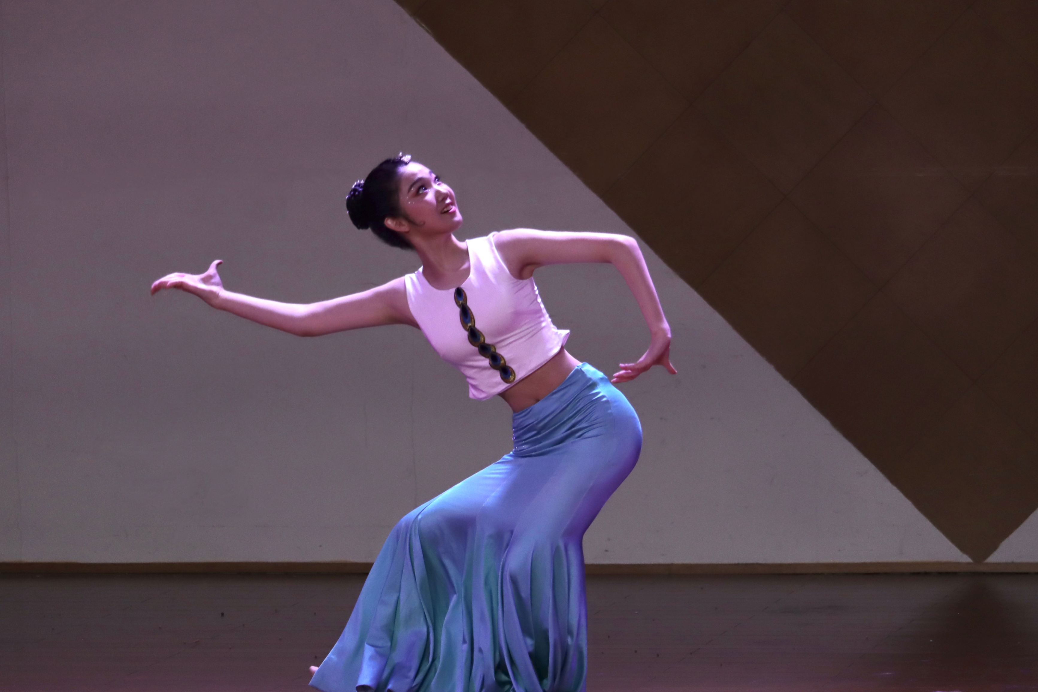 20歌舞班黄伊辰演唱新疆歌曲《打起手鼓唱起歌》,穿着一身新疆民族的服饰,拿着手鼓上场,把观众带入鲜花怒放碧草无垠的美丽新疆;展示傣族舞《花儿》展示傣族女儿该有的灵动和令人陶醉的柔美。