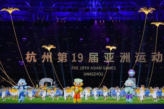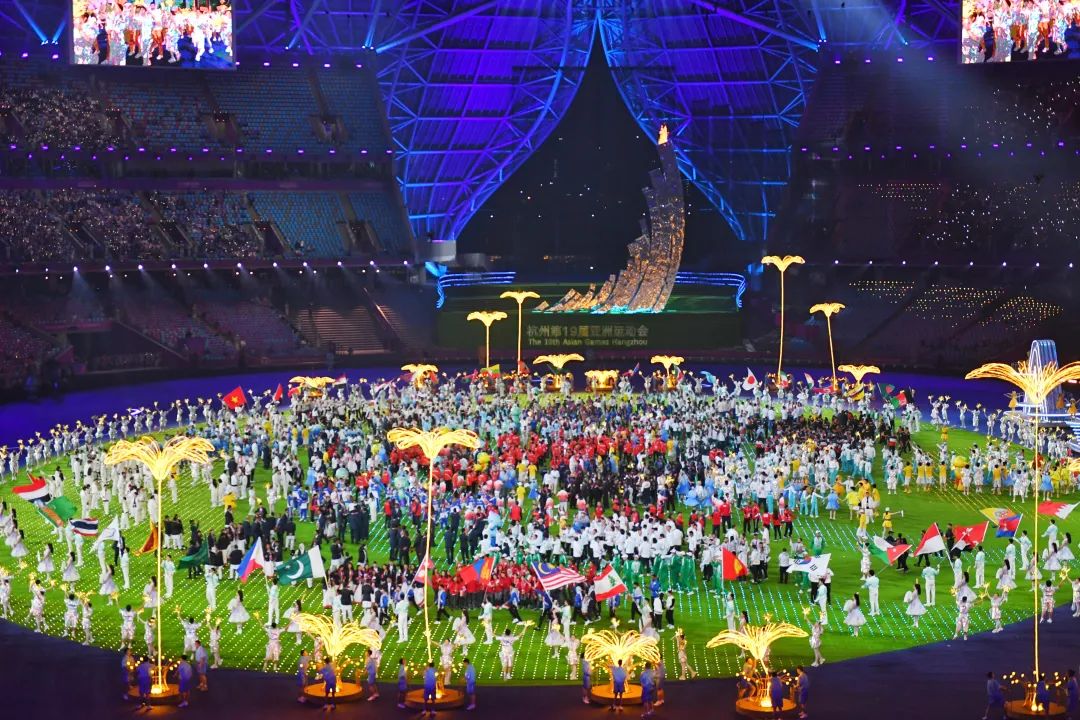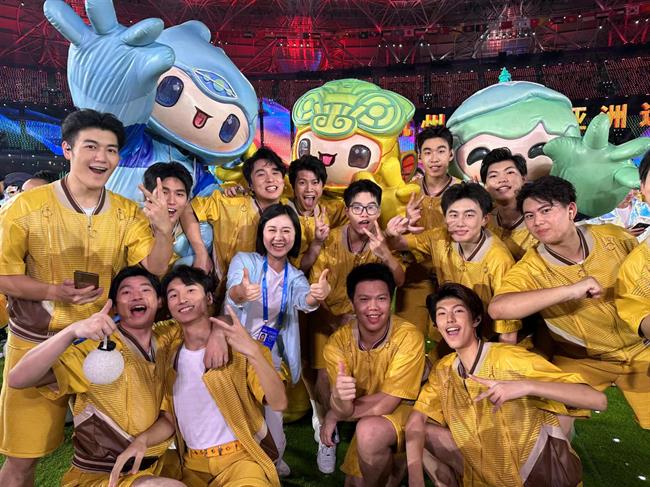 在火炬熄灭环节中,戏剧影视学院、音乐学院、演艺与教育学院学生在正对主席台主表演区核心区域进行歌舞表演,与数字火炬人“弄潮儿”一起带动现场观众对着火炬比心,见证亚运会火炬塔的熄灭。