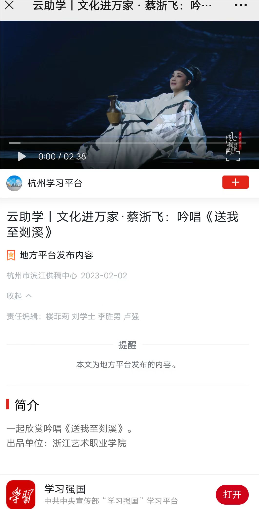 学习强国杭州平台:云助学丨文化进万家·蔡浙飞:吟唱《送我至剡溪》
