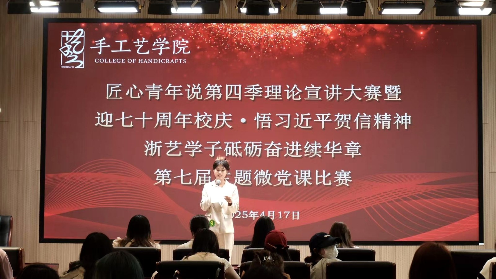 4月17日,手工艺学院在新教学楼A102小报告厅举办“匠心青年说”第四季理论宣讲大赛暨“迎七十周年校庆·悟习近平贺信精神浙艺学子砥砺奋进续华章”第七届主题微党课比赛。10名手工艺学子为大家呈现了一场独具匠心、声情并茂的宣讲盛宴。